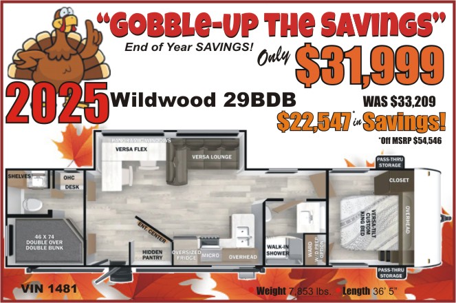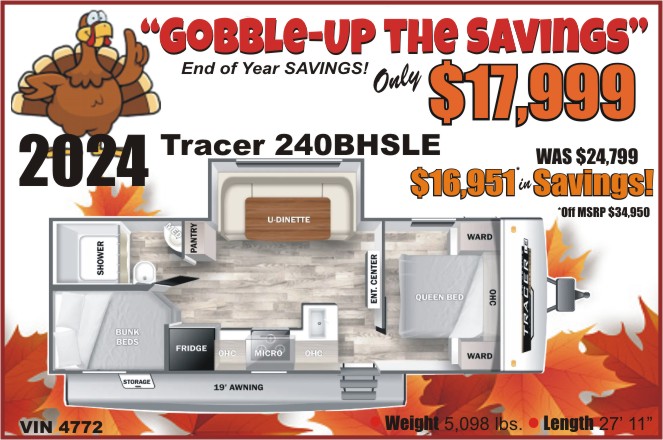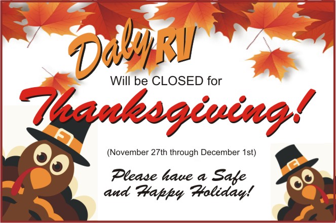 Daly RV will be closed to enjoy Thanksgiving with our family and friends from Thursday, November 27th through Monday December 1st… we will be open Tuesday, December 2nd at 8:30AM. Please have a safe and Happy Thanksgiving!