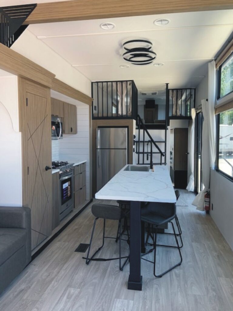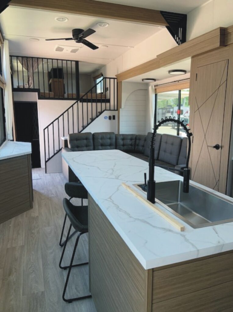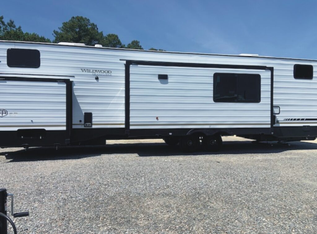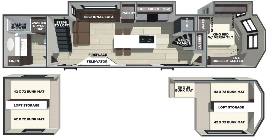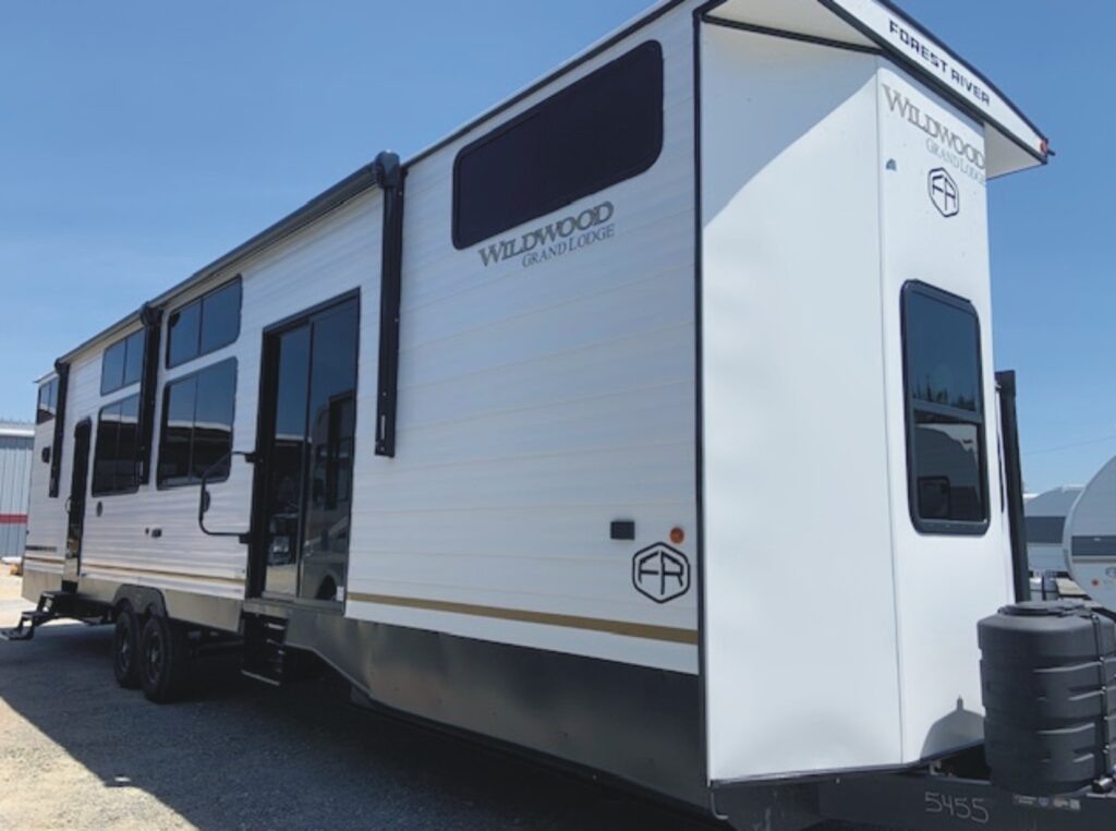 The 2026 Wildwood Grand Lodge 42ICE (VIN 5455) is another spacious double loft destination trailer w/ front King Bed w/ Versa Tilt & overhead loft w/ three bunk mats & loft storage, central living area w/ kitchen island counter, sectional sofa, and rear bathroom w/ overhead loft w/ two bunk mats & loft storage.