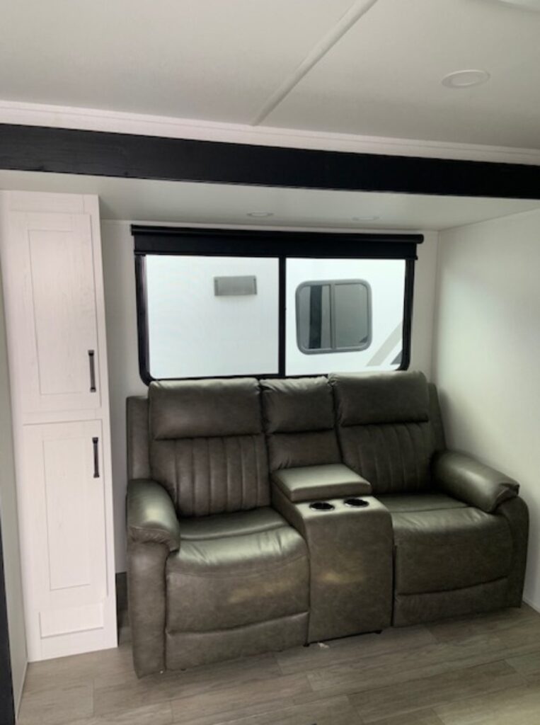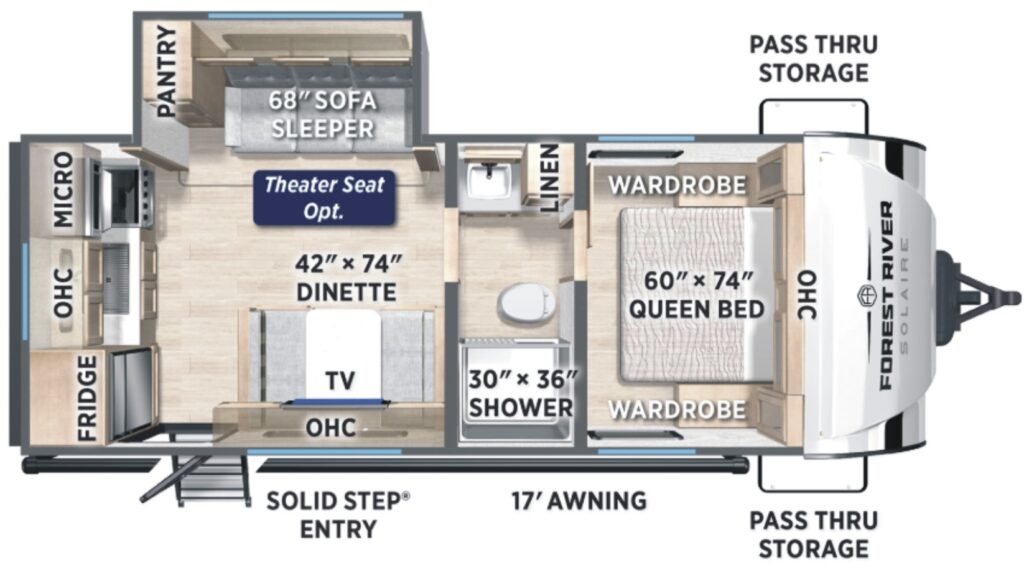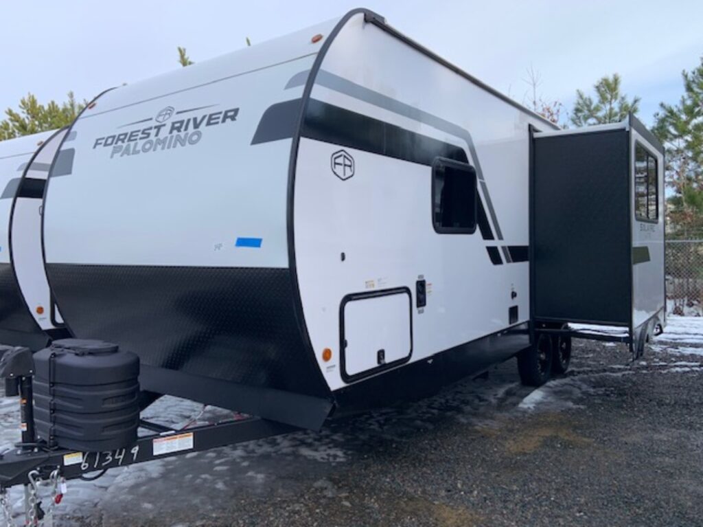 The ALL NEW 2026 Palomino Solaire Travel Trailer Model 237RK (VIN 1349) offers a front Queen bed, walk-through bathroom, rear living area featuring sofa/sleeper slide-out, side dinette, and rear galley kitchen area.