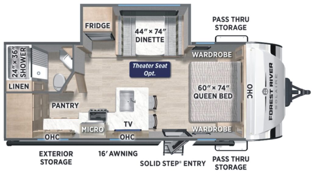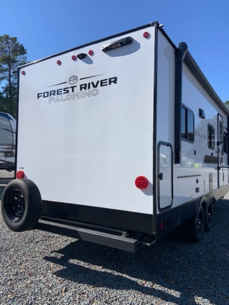 The ALL NEW 2026 Palomino Solaire Travel Trailer Model 232UD (VIN 1210) offers a front Queen bed, dinette / refrigerator slide-out, L-shaped kitchen counter w/ counter seating, rear pantry and rear bathroom.