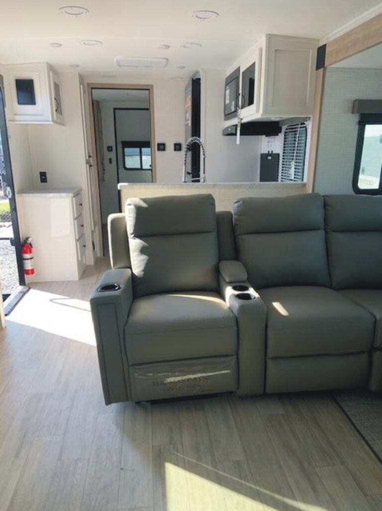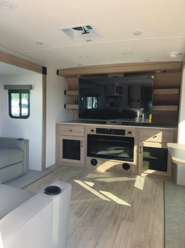The ALL NEW 2026 Palomino Solaire Ultra Lite Travel Trailer Model 3300FLBS (VIN 1393) offers a unique floor plan w/ very comfortable front living area featuring an entertainment center w/ fireplace, sectional sofa, and dinette area, mid-kitchen area, mid-rear bedroom area w/ King Bed, desk, and wardrobe space, and large rear bathroom area w/ washer & dryer prep.
