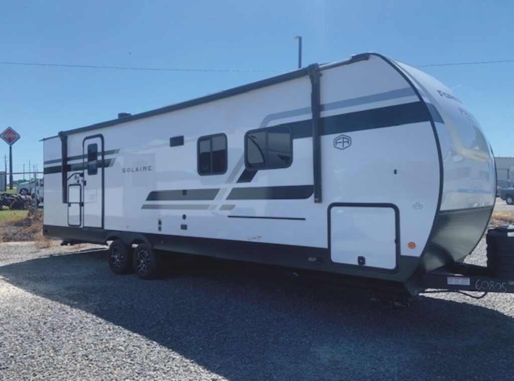 The ALL NEW 2026 Palomino Solaire Ultra Lite Travel Trailer Model 2580RBSS (VIN 0805) features a front bedroom w/ 60” X80” Queen bed, large open living area w/ well appointed kitchen and hidden pantry, dinette and sofa sleeper, plus rear bathroom area w/ linen closet and washer/dryer prep.