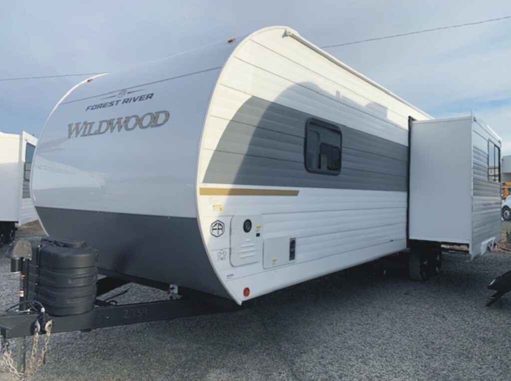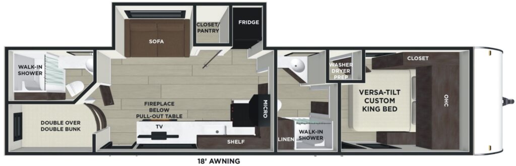 The 2026 Wildwood Travel Trailer Model 320ICE (VIN 2759) features a front bedroom w/ Versa-Tilt Custom King Bed & washer/dryer prep, walk-through bathroom, central living area, rear bathroom, and double over double bunk.