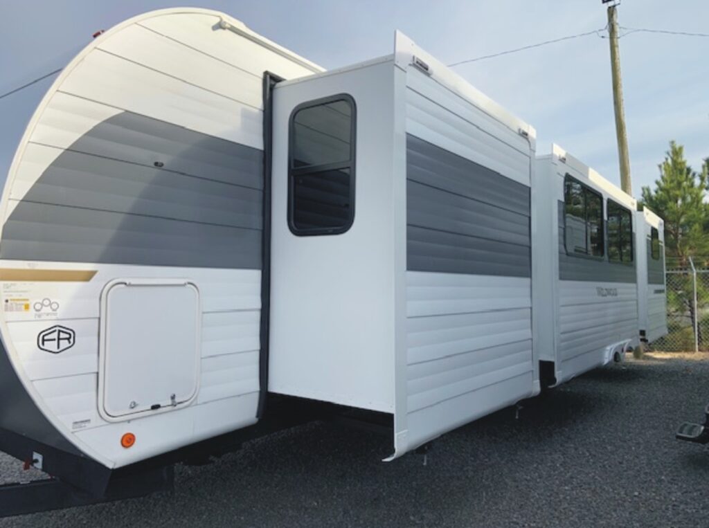 The 2026 Wildwood Travel Trailer Model 33TS-63 (VIN 3230) is the ultimate bunkhouse, with three total slide outs and an outside kitchen. This well-equipped travel trailer features oversized panoramic windows and the desirable Versa-Lounge. The back-bunk room features the Versa-Queen giving this floorplan the option for two queen beds!