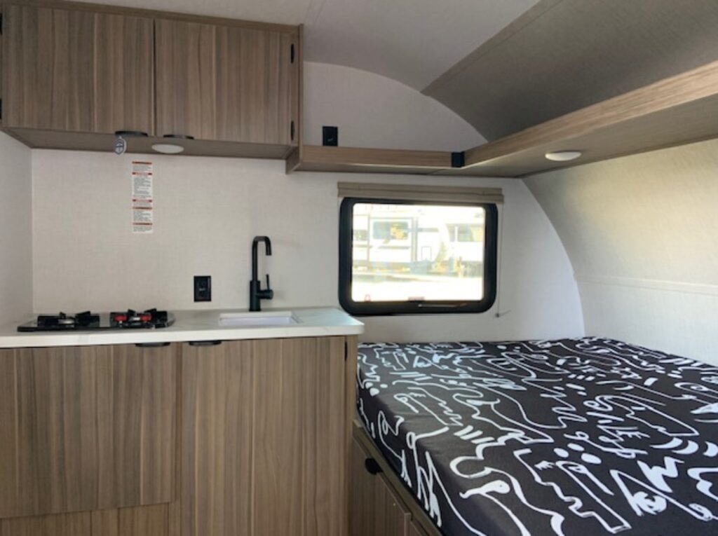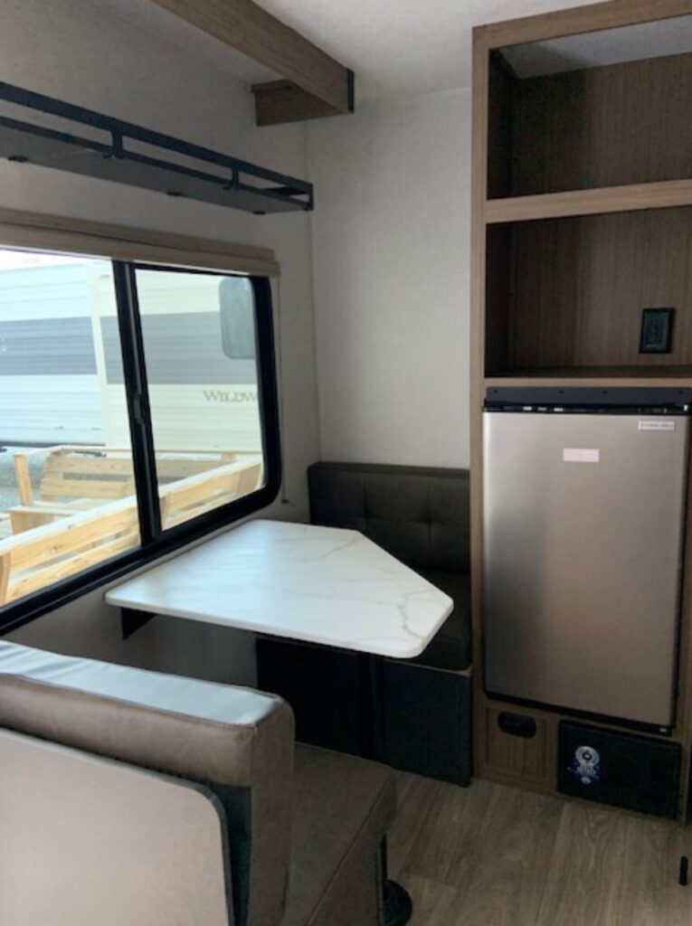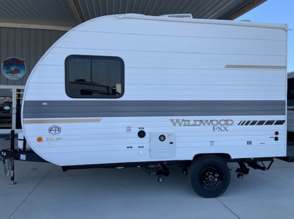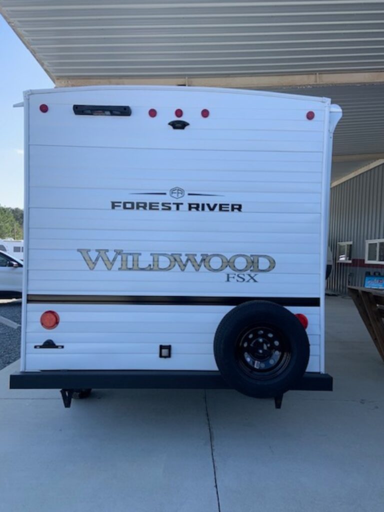 The Wildwood FSX Travel Trailer Model 135ICE-98 (VIN 6353) features a light weight travel trailer with a East to West Custom Queen bed, galley kitchen, side dinette, and rear bathroom with walk-in shower.
