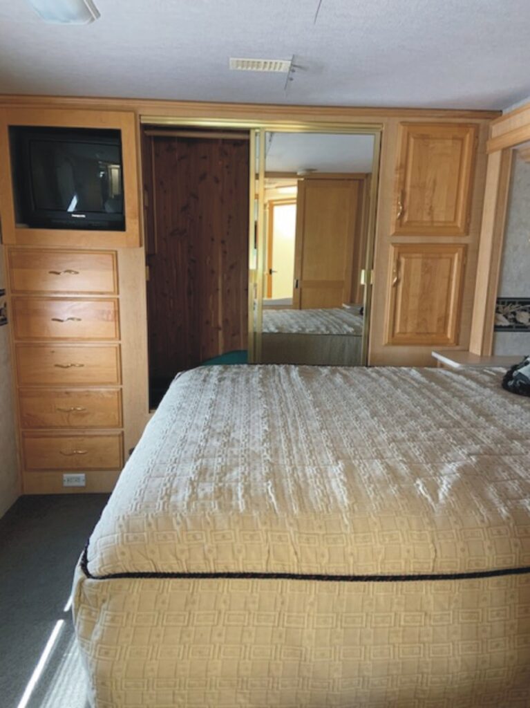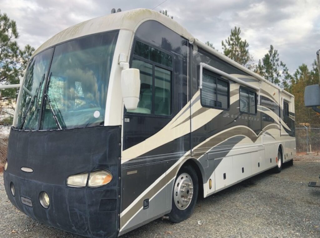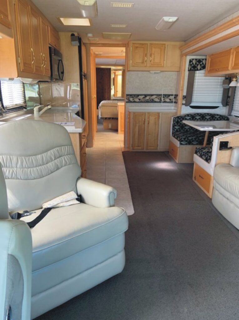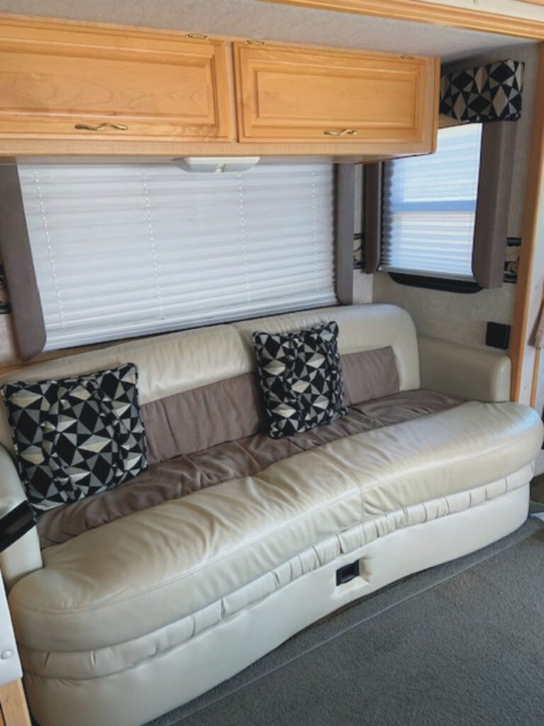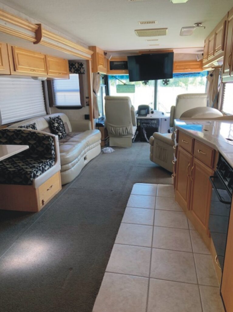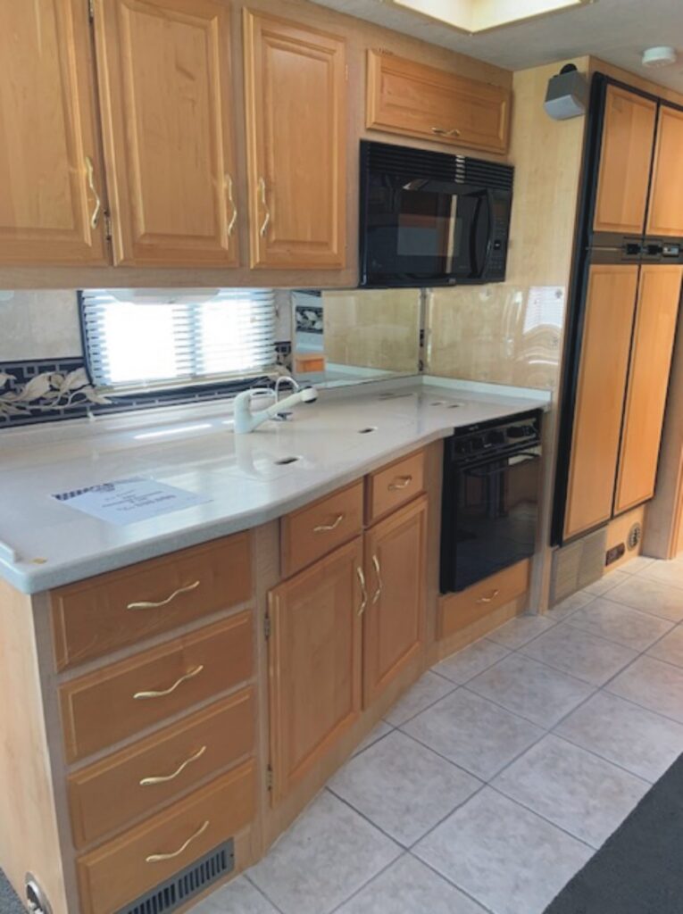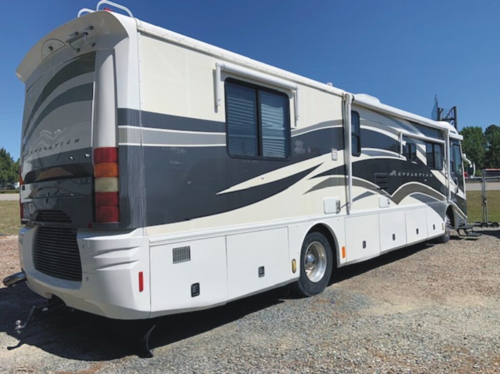 The Pre-Enjoyed 2002 Fleetwood Revolution Class A Motorhome Model M-38B (VIN 7862) features a multi-slide-outs creating a spacious living area, large kitchen counter space, walk-through bathroom w/ glass enclosed shower, and rear slide-out bedroom area.