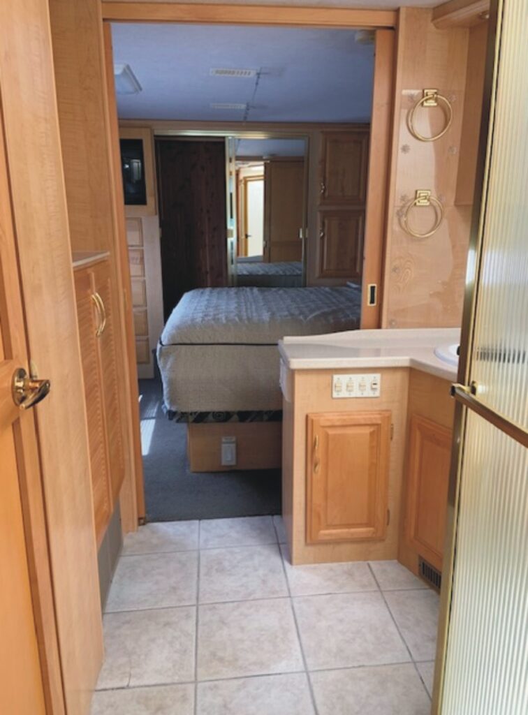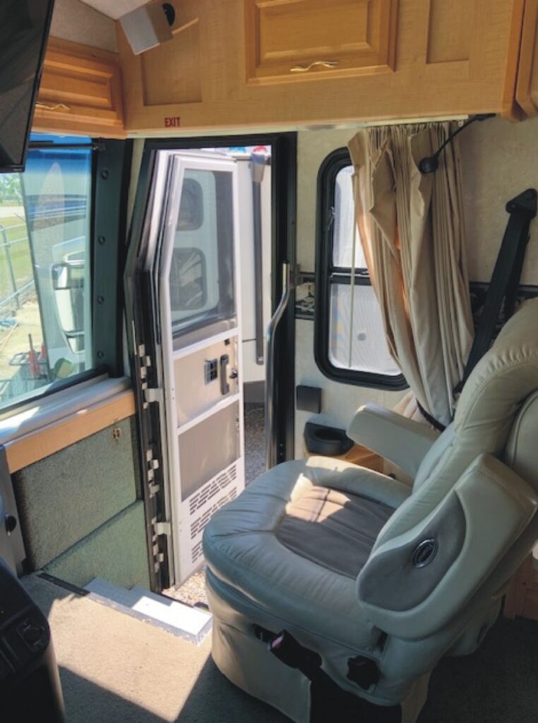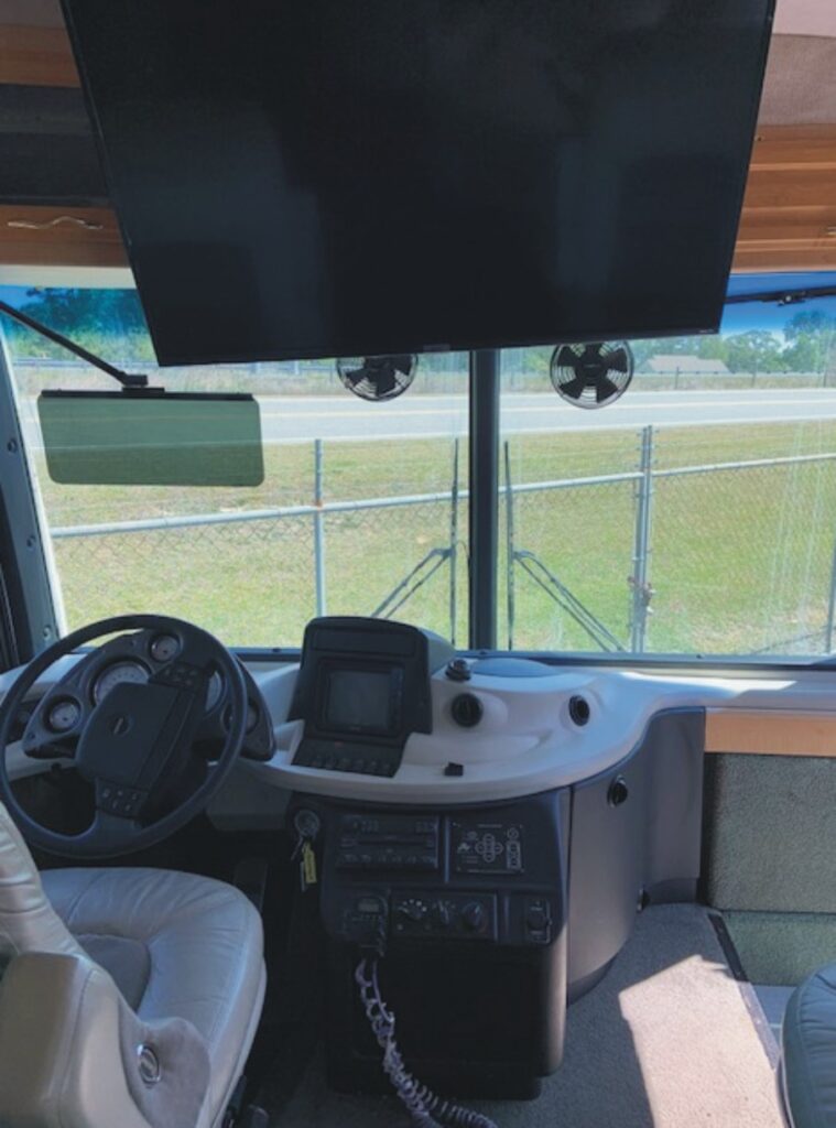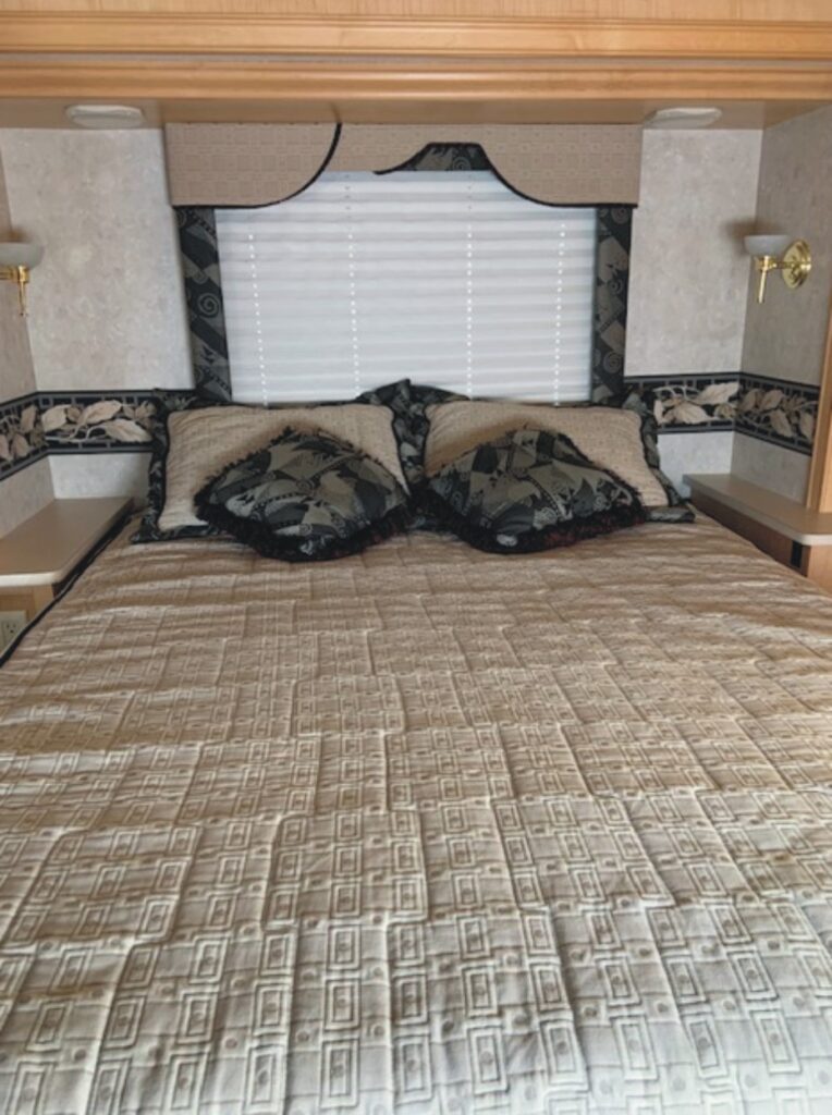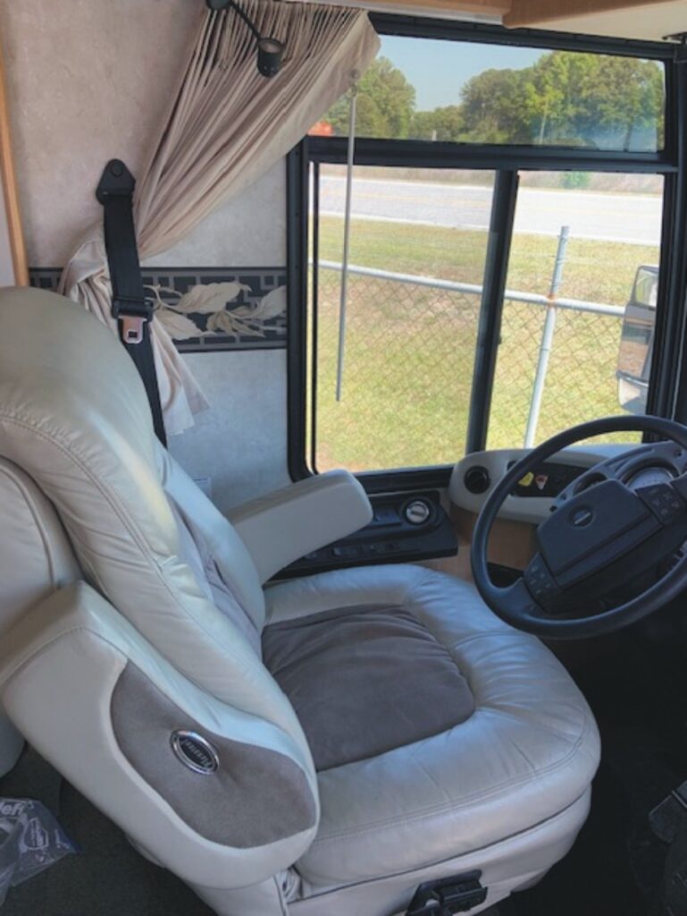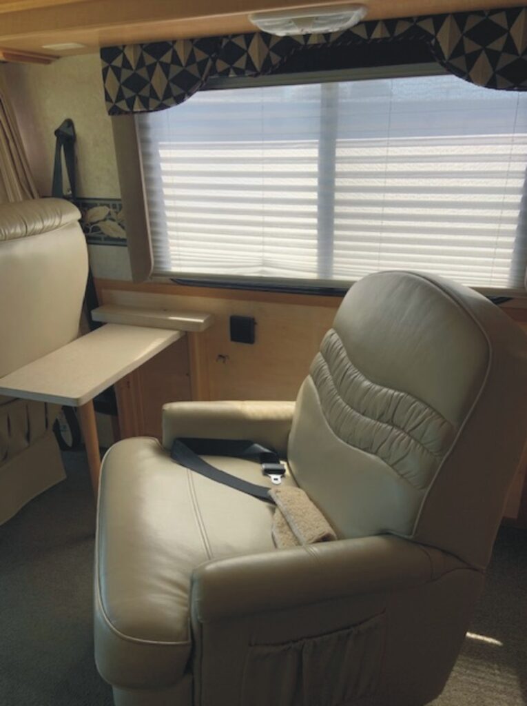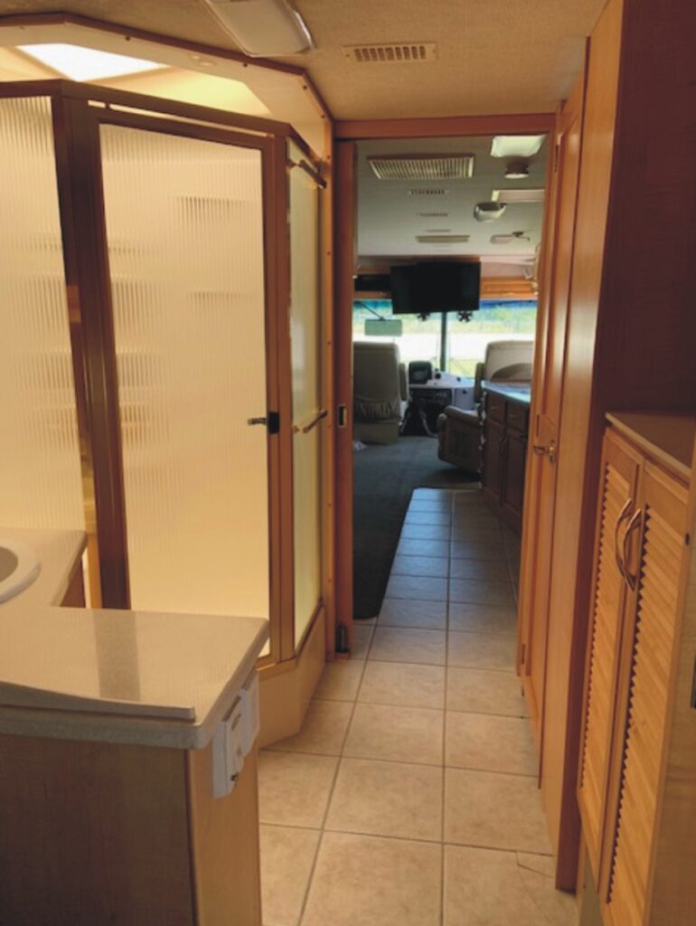 The Pre-Enjoyed 2002 Fleetwood Revolution Class A Motorhome Model M-38B (VIN 7862) features a multi-slide-outs creating a spacious living area, large kitchen counter space, walk-through bathroom w/ glass enclosed shower, and rear slide-out bedroom area.