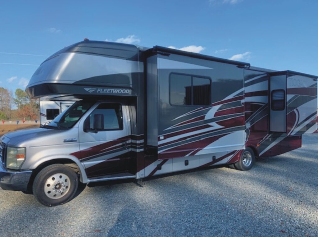 Featuring: Ford F450 chassis w/ F450 gas engine, 27,446 miles, Onan generator, fresh water capacity 60gals., Gray water capacity 35gals., Black water capacity 35gals., 30AMP electrical service, 59lbs. LP, fiberglass exterior, outside storage, 13.5K BTU ducted air conditioner, double entry step, 20’ awning, two slide-outs w/ slide-out awnings, back-up camera, roof access ladder, outside speakers, entertainment center, double basin stainless steel sink, high profile faucet, 3 burner range, oven, microwave, refrigerator, and glass enclosed shower.