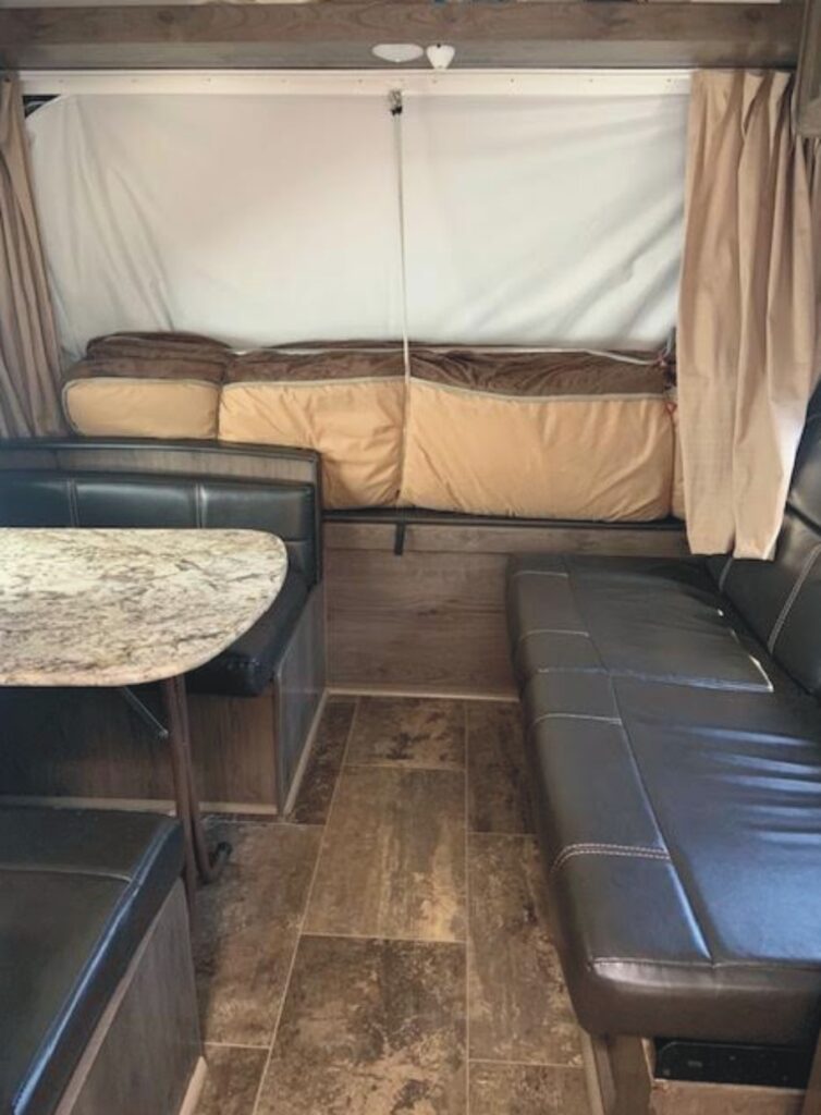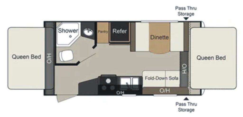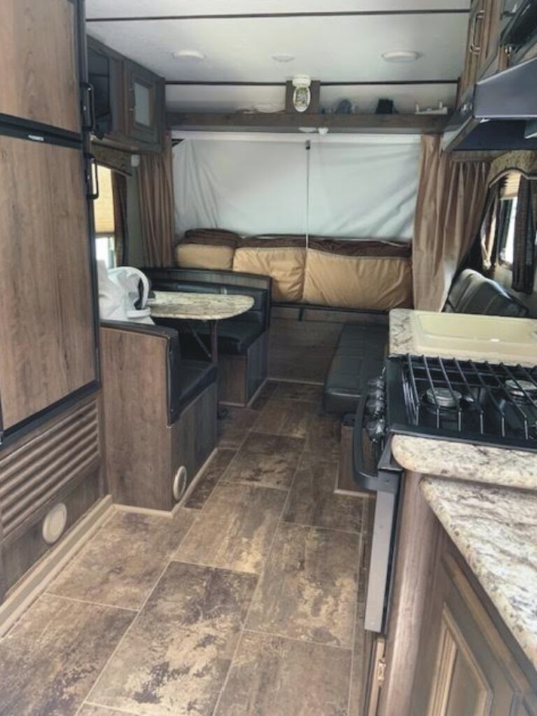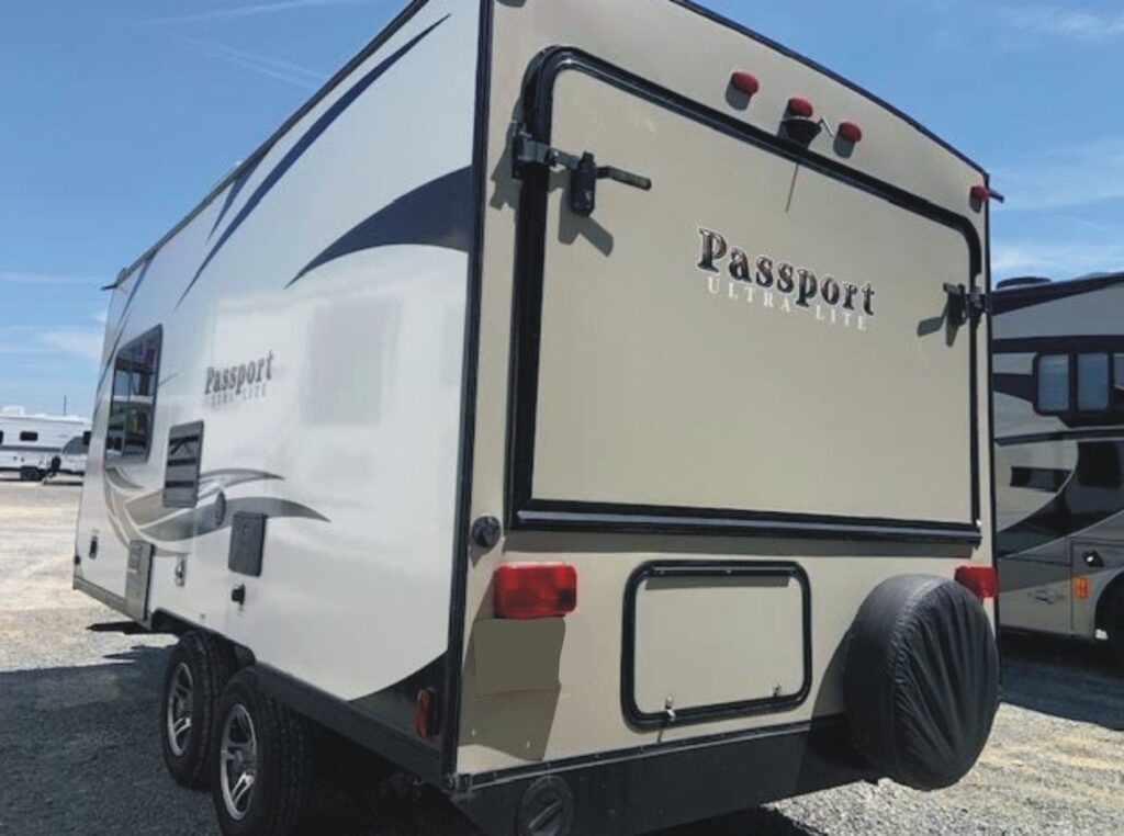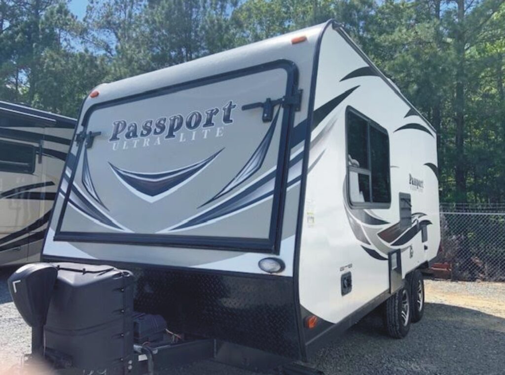 The Pre-Enjoyed 2018 Keystone Passport Hybrid Travel Trailer Model 171EXP (VIN 5419) features a front and rear fold-out tented Queen bed, fold down sofa, side dinette, galley kitchen, and bathroom w/ shower.