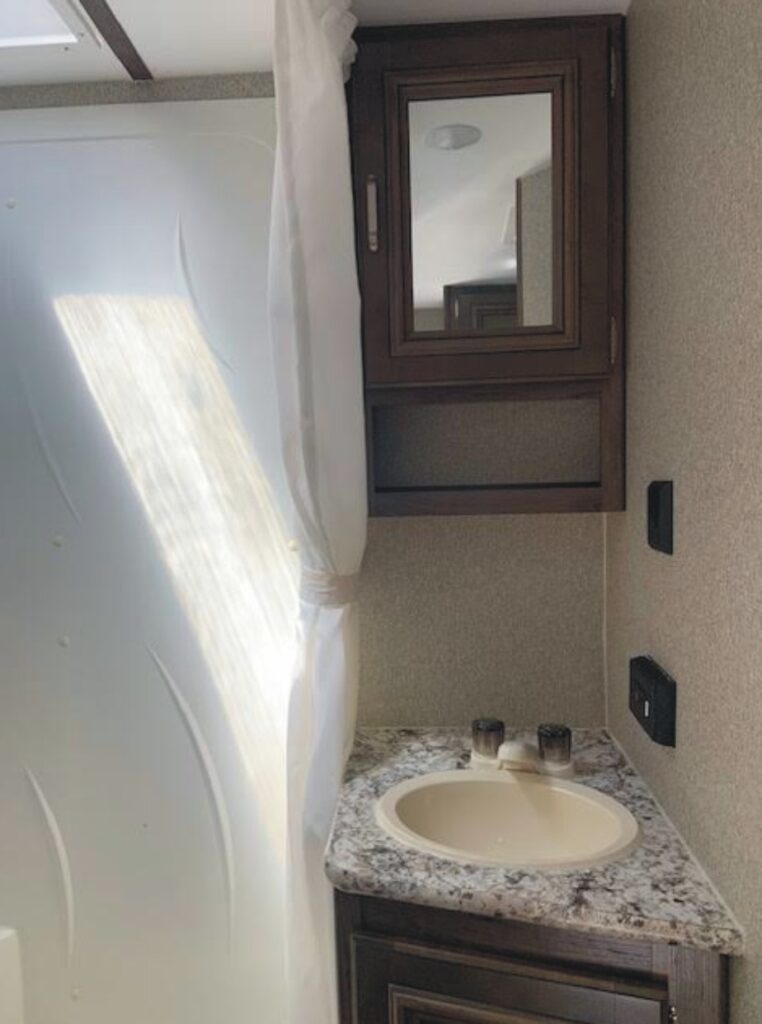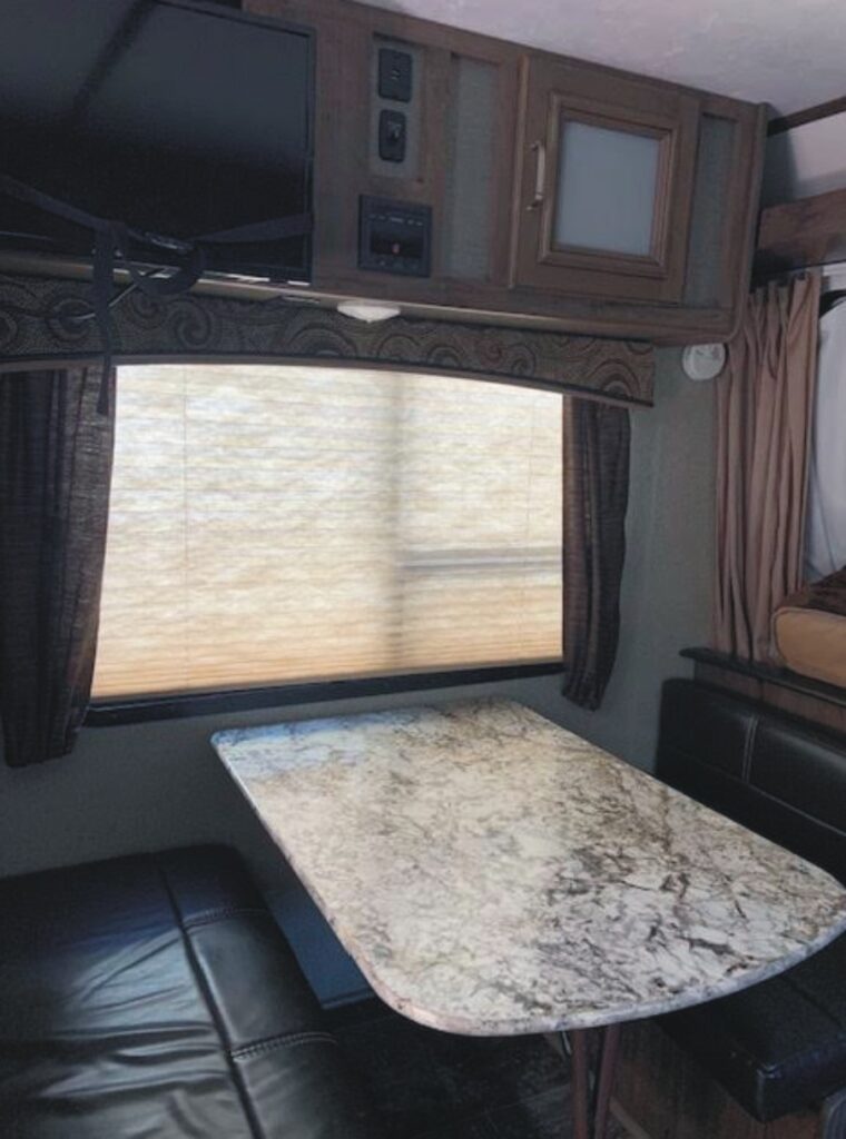 Featuring: Fresh water capacity 43Gals., Gray water capacity 38Gals., Black water capacity 38Gals., 30AMP electric service, dual LP tanks w/ hard cover, 13.5BTU air conditioner, front stone guard, double steps into living area, fold-away entry bar, battery w/ box, spare tire w/ cover, 10’ power awning, power tongue jack w/ light, crank-down stabilizer jacks, dinette, sofa sleeper, double basin sink w/ high profile faucet, 3-burner range, refrigerator, microwave, 6Gal. water heater,